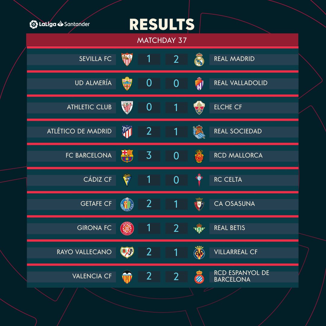 สรุปผลการแข่งขัน ลาลีกา สเปน หลังจบสัปดาห์ที่ 37