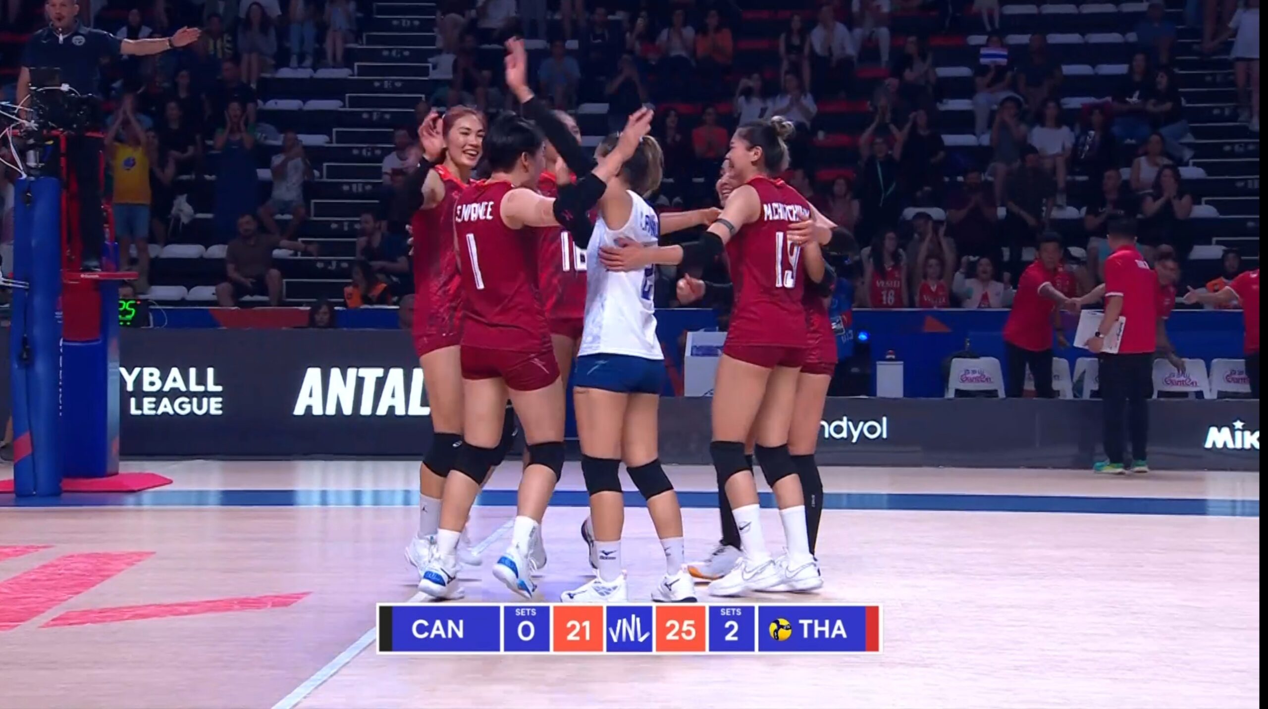 เข้าสู่ช่วงกลางเซต 10-4 แคนาดายังมีปัญหาบอลแรกไม่เข้าจุด ผิดพลาดบอลเสิร์ฟ บอลไหลหลังสองลูกติด ส่งไทยนำยาว 12-5 แม้ว่าแคนาดาจะเกมรับเหนียวขึ้น แต่ไม่อาจต้านทานความร้อนแรงของมดวิ ตบบอลทับนำยาวเป็น 15-7