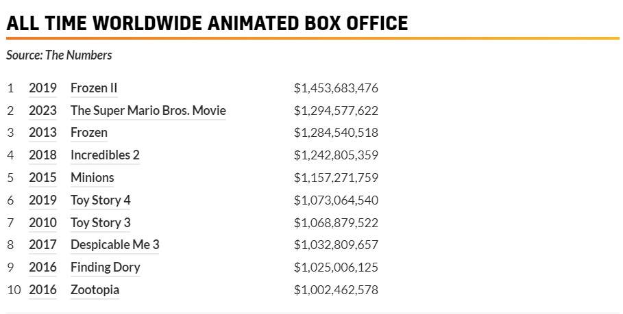 วันที่ 1 มิถุนายน 2023 ทาง VGC ได้ออกมารายงานว่า The Super Mario Bros. Movie สามารถทำเงินไปได้มากกว่า 1.29 พันล้านเหรียญฯ ขึ้นแท่นอันดับ 2 หนังแอนิเมชั่นทำรายได้มากที่สุดในโลก เป็นรองแค่ Frozen 2 เพียงเรื่องเดียวเท่านั้น