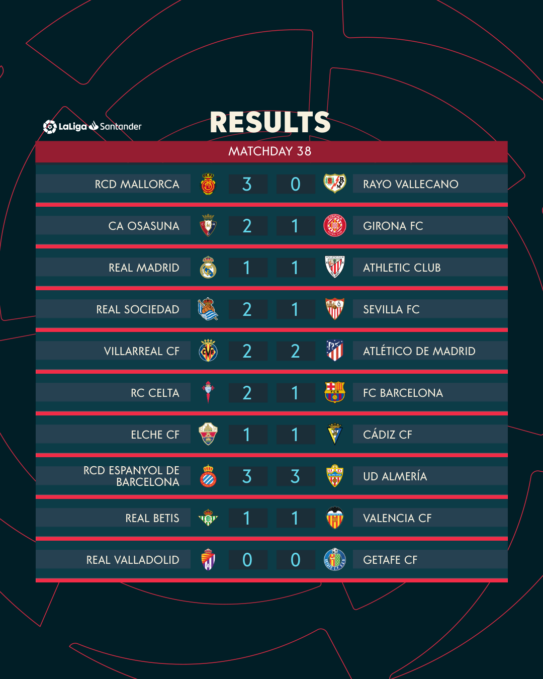 ขณะที่ “ราชันชุดขาว” เรอัล มาดริด เพวกเขาต้องเสียแชมป์ให้กับคู่ปรับตลอดไปอย่างน่าเจ็บปวด หลังไม่มีความสม่ำเสมอในการเก็บแต้ม โดยมีคะแนนห่างจาก “เจ้าบุญทุ่ม” ถึง 10 แต้มเลยทีเดียว และยังเป็นการปิดฉากอำลานักเตะตัวเก๋าอย่าง คาริม เบนเซม่า, เอแด็น อาซาร์ และ มาร์โก อเซนซิโอ ไม่ค่อยสวยหรูนัก