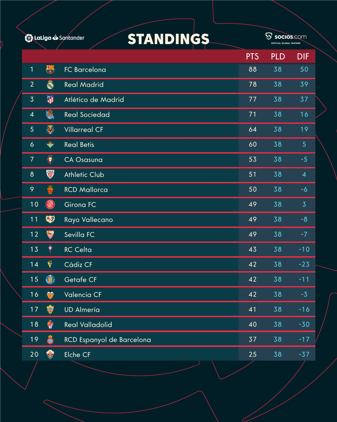 อันดับตารางคะแนน ลาลีกา สเปน 2022/2023 หลังจบนัดที่ 38 โดย 5 อันดับแรกในตารางเป็นไปตามลำดับมีดังนี้