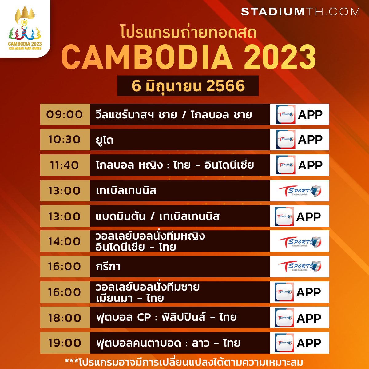 โปรแกรมถ่ายทอดสด อาเซียนพาราเกมส์ ครั้งที่ 12 ประจำวันอังคารที่ 6 มิถุนายน พ.ศ. 2566 ทางช่อง T Sports 7 และ T Sports 7 แอปปลิเคชัน