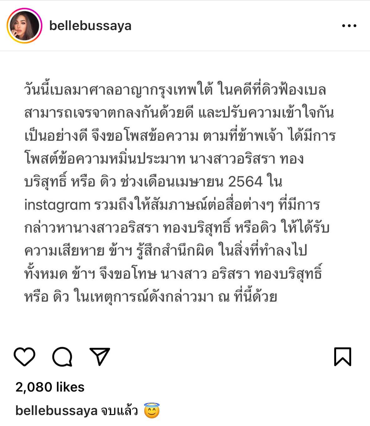 ความยุติธรรมมีจริง ดิว อริสรา ประกาศชัยชนะ หลังฟ้องคู่กรณี เบลล์ บุษยา ข้อหาหมิ่นประมาท แม้ผ่านมาหลายปี ถึงวันนี้ที่รอคอย ด้านคู่กรณีโพสต์จบเรื่อง