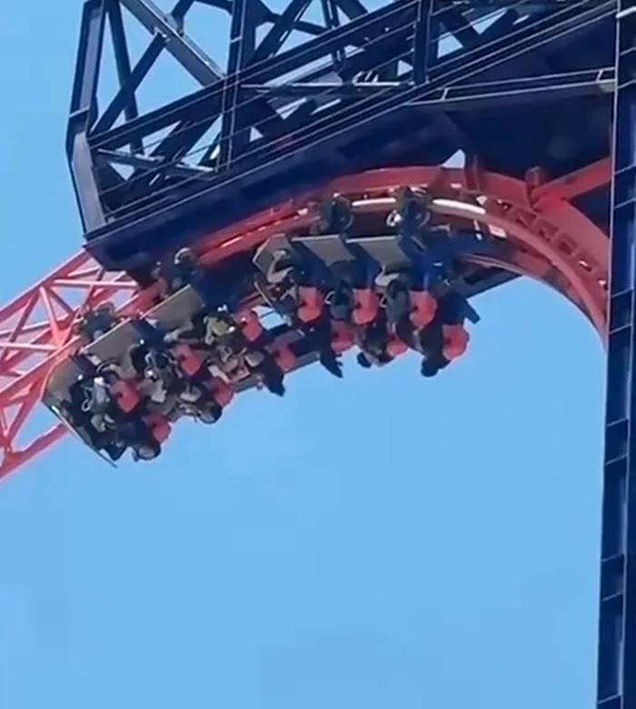 สยอง! รถไฟเหาะค้าง นักท่องเที่ยวห้อยหัวติดอยู่ในเครื่องนานครึ่งชั่วโมง