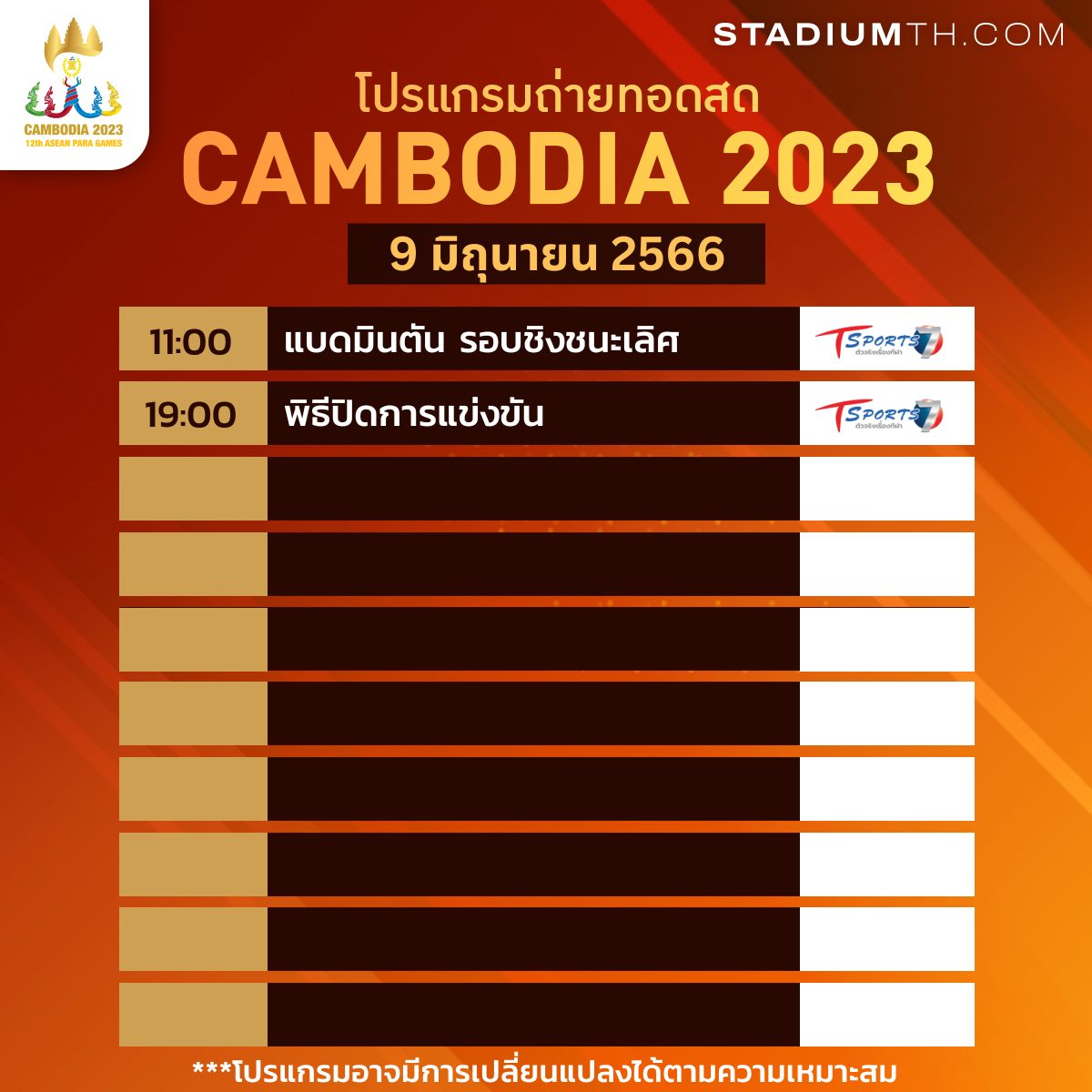 โปรแกรมถ่ายทอดสด อาเซียนพาราเกมส์ ครั้งที่ 12 ประจำวันศุกร์ที่ 9 มิถุนายน พ.ศ. 2566 ทางช่อง T Sports 7 และ T Sports 7 แอปปลิเคชัน