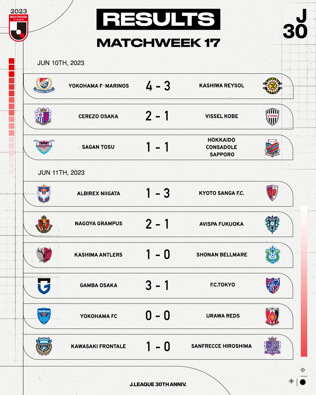สรุปผลการแข่งขัน เจลีก ญี่ปุ่น 2023 หลังจบนัดที่ 17 (อัปเดตวันที่ 12 มิถุนายน 2566)