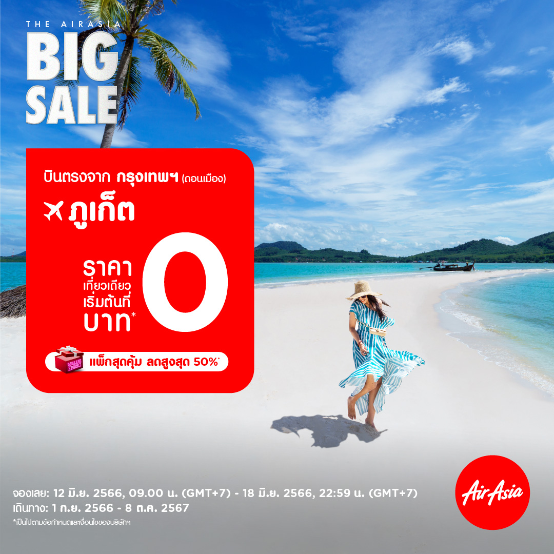 แอร์เอเชีย (Airasia) ชวนวางเเผนเที่ยวล่วงหน้า กับโปรโมชั่นใหญ่ “BIG SALE #SIZEMATTERS ฝูงบินใหญ่ บินมั่นใจกับแอร์เอเชีย” ตำนานโปรโมชั่น บินสุดคุ้มราคาเริ่มต้นที่ 0 บาทต่อเที่ยว ทั้งเส้นทางบินในเเละต่างประเทศ สำหรับเที่ยวบินรหัส FD จำนวน 80,000 ที่นั่ง เปิดจองแล้วตั้งเเต่ 12 – 18 มิถุนายน 2566 เริ่มเดินทาง 1 กันยายน 2566 – 8 ตุลาคม 2567 ดูรายละเอียดเเละสำรองที่่นั่งที่ airasia Superapp