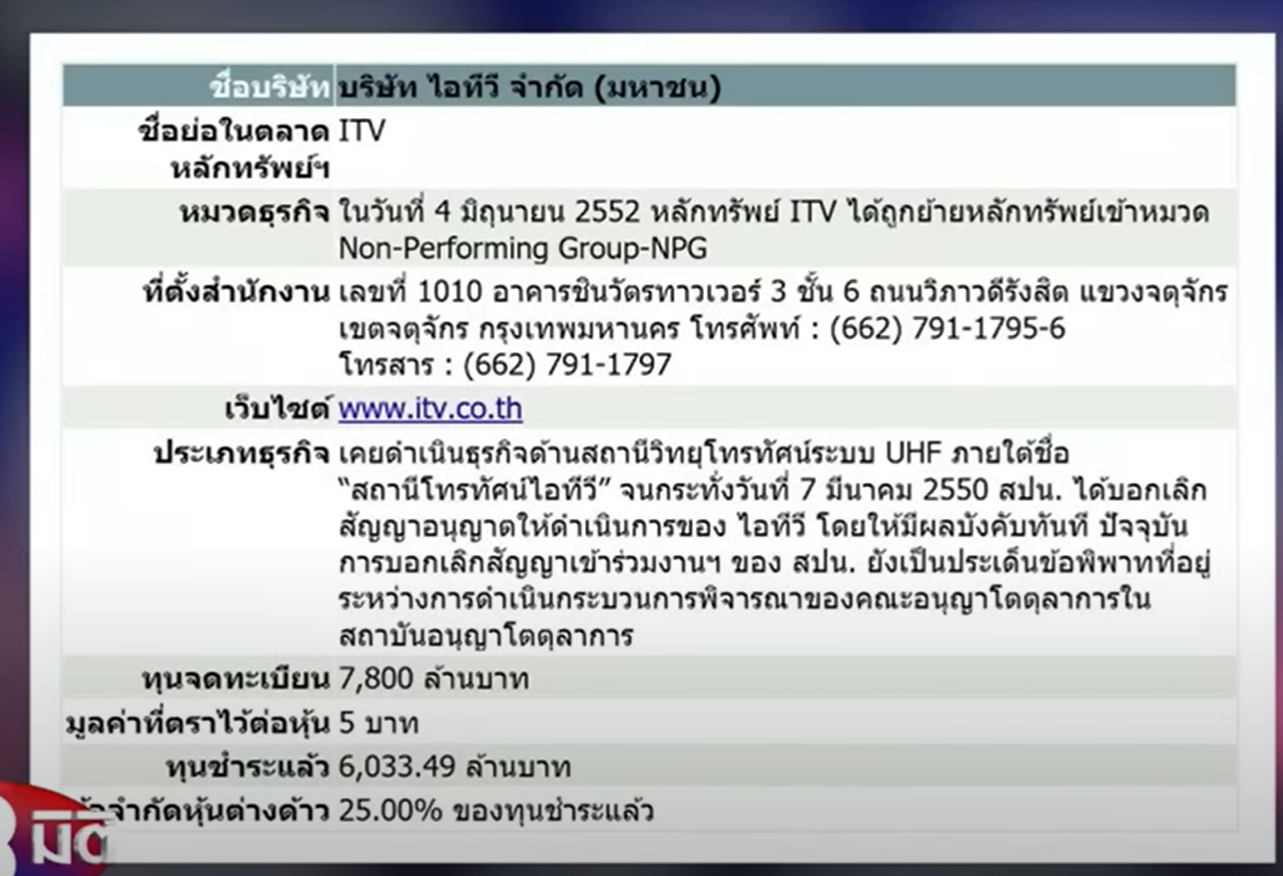 จากเอกสารแบบนำส่งงบการเงิน ของบริษัทไอทีวี เมื่อวันที 10 พ.ค. 2566 เป็นงบการเงินบัญชีรอบปีสิ้นสุด วันที่ 31 ธ.ค. 2565 ซึ่งได้รับอนุมัติจากที่ประชุมผู้ถือหุ้นครั้งที่ 1 เมื่อวันที่ 26 เม.ย. 2566 และเอกสารรายงานความเห็นการสอบบัญชี วันที่ 24 พ.ค. 2566 ระบุว่า บริษัทไอทีวี มีประเภทธุรกิจเป็นสื่อโทรทัศน์ สินค้า สื่อโฆษณา และผลตอบแทนจากการลงทุน