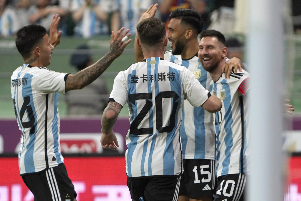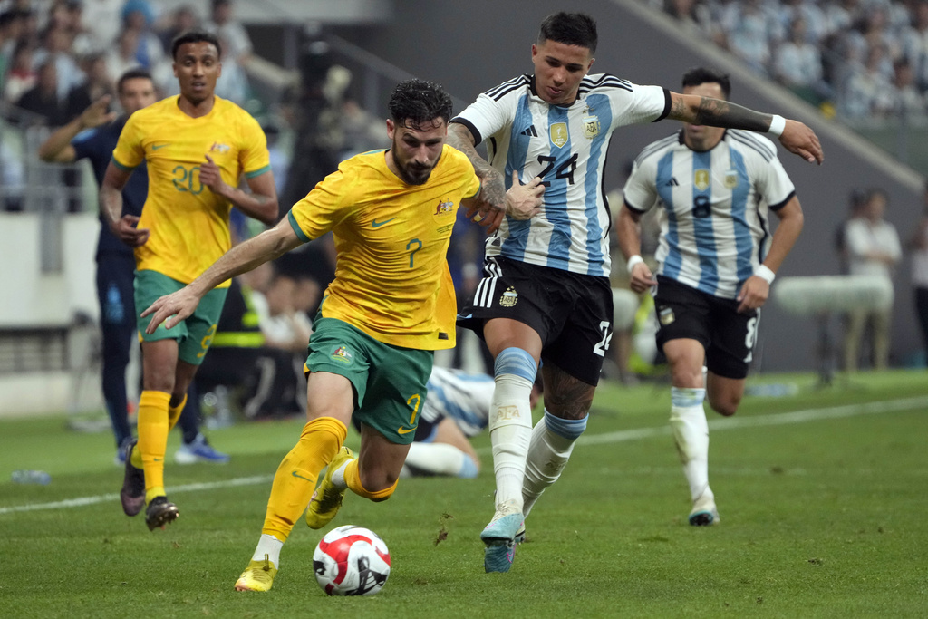 Argentina’s Lionel Messi, right, celebrates with teammates after scoring a goal against Australia during the first half of their friendly soccer match at Workers’ Stadium in Beijing, Thursday, June 15, 2023. (AP Photo/Mark Schiefelbein)Australia’s Mathew Leckie drives the ball past Argentina’s Enzo Fernandez during the second half of their friendly soccer match at Workers’ Stadium in Beijing, Thursday, June 15, 2023. (AP Photo/Mark Schiefelbein)