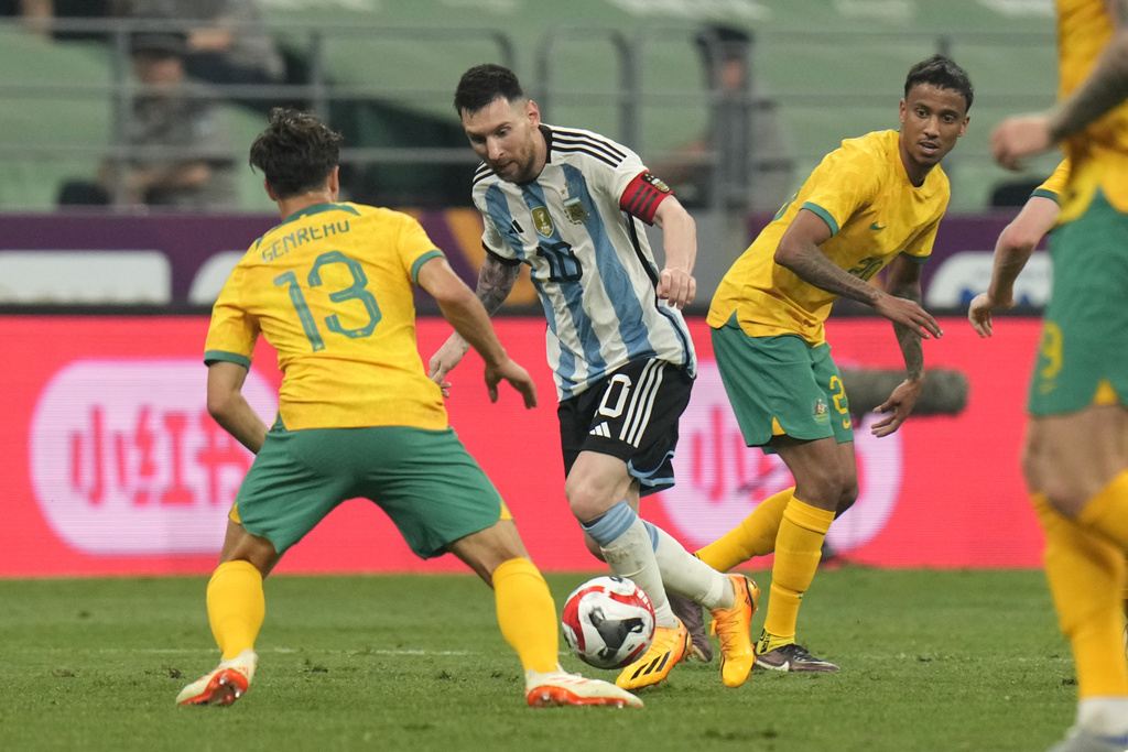 Argentina’s Lionel Messi, center, battles for the ball against Australia’s Dennis Genreau, left, and Australia’s Keanu Baccus during their international friendly soccer match at the Workers’ Stadium in Beijing, China, Thursday, June 15, 2023. (AP Photo/Andy Wong)Argentina’s Lionel Messi, left, battles for the ball against Australia’s Kye Rowles during their friendly soccer match at the Workers’ Stadium in Beijing, China, Thursday, June 15, 2023. (AP Photo/Andy Wong)