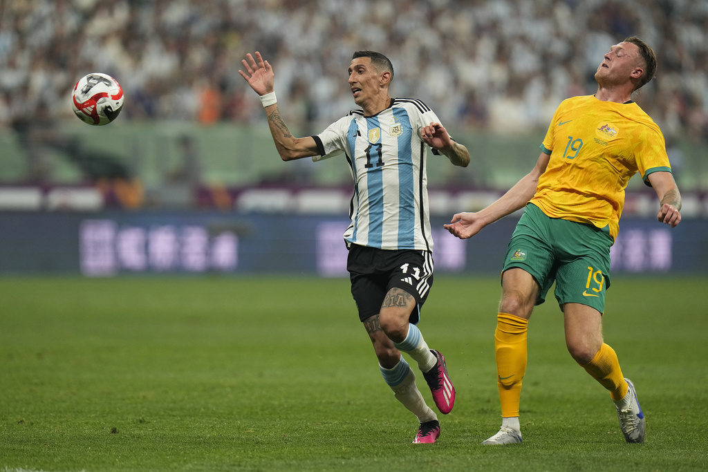 Argentina’s Lionel Messi, left, shoots the ball at the goal past Australia’s Kye Rowles during the first half of their friendly soccer match at Workers’ Stadium in Beijing, Thursday, June 15, 2023. (AP Photo/Mark Schiefelbein)Argentina’s Angel Di Maria, left, is tackled by Australia’s Harry Souttar during their friendly soccer match at the Workers’ Stadium in Beijing, China, Thursday, June 15, 2023. (AP Photo/Andy Wong)