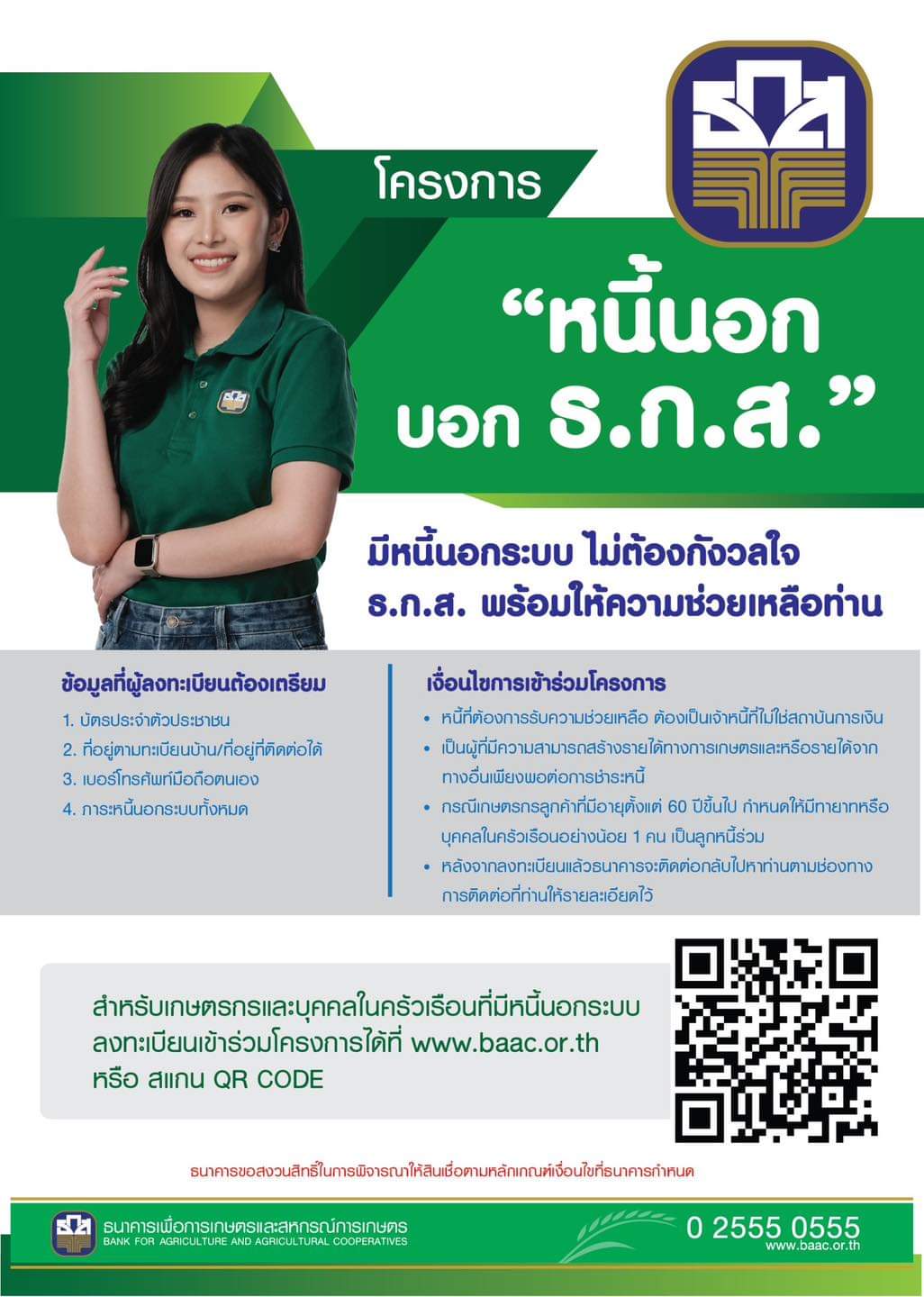 ธ.ก.ส. เปิดตัวโครงการ ลงทะเบียน “มีหนี้นอกบอก ธ.ก.ส.” เปิดช่องทางให้เกษตรกรลูกค้าและคนในครอบครัวที่มีหนี้นอกระบบและต้องการก้าวพ้นกับดักหนี้อย่างยั่งยืน แจ้งความต้องการง่าย ๆ เพียงลงทะเบียนผ่าน www.baac.or.th และ Line BAAC Family เพื่อนัดหมายให้คำปรึกษาในการแก้ไขปัญหาหนี้ รวมถึงสนับสนุนเงินทุนที่มีอัตราดอกเบี้ยผ่อนปรน เพื่อใช้ในการแก้ปัญหาหนี้นอกระบบ การลงทุนสร้างอาชีพ สร้างรายได้