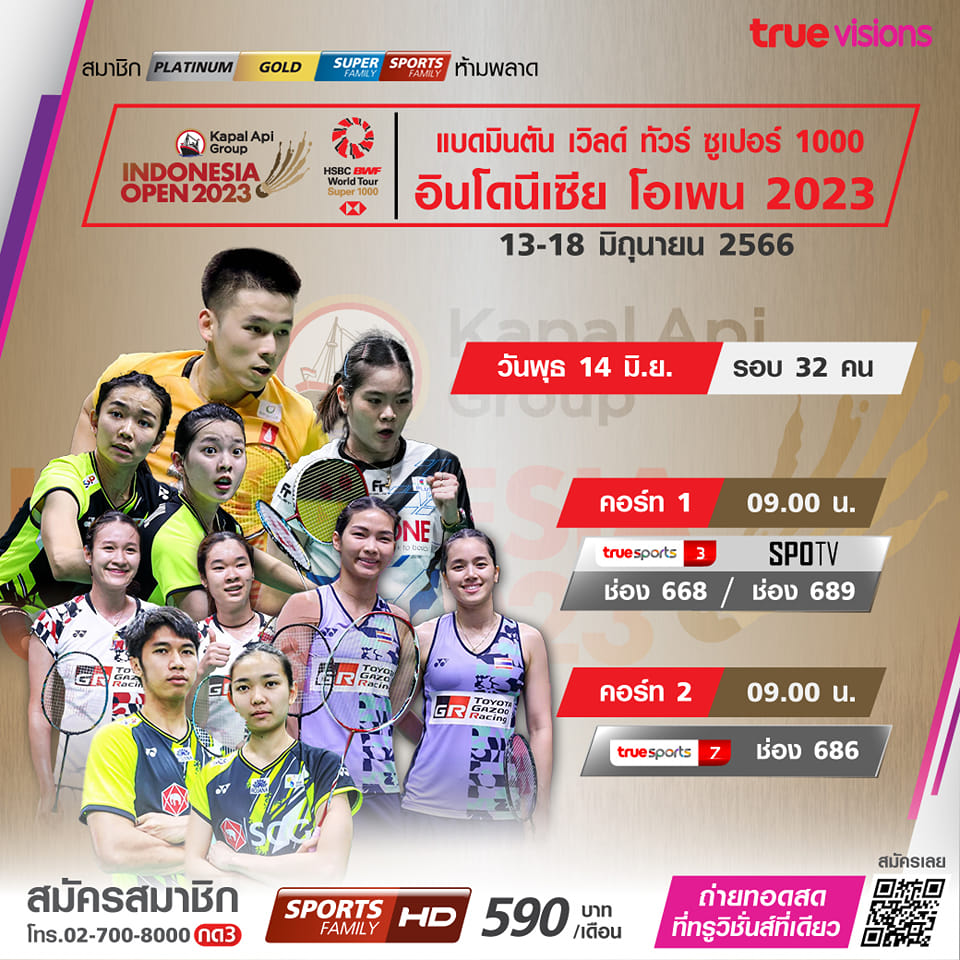 สำหรับแบดมินตันรายการ คาปาล อาปี กรุ๊ป อินโดนีเซีย โอเพ่น 2023 แฟนๆแบดมินตันติดตามชมการถ่ายทอดสดได้ที่ช่อง SPOTV (689) , True Sport 3 (668) และ True Sport 7 (686)