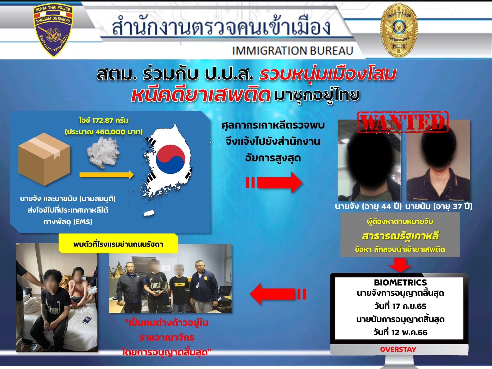 พฤติการณ์กล่าวคือ สำนักงานอัยการสูงสุด สาธารณรัฐเกาหลี ได้ประสานมายัง ป.ป.ส. และ บก.สส.สตม. ขอความร่วมมือ ให้สืบสวนติดตามตัว นายนัม และนายจัง ชาวเกาหลีใต้ ซึ่งเป็นผู้ต้องหาตามหมายจับของสาธารณรัฐเกาหลี กระทำความผิดฐานลักลอบนำเข้ายาเสพติด หลบซ่อนตัวอยู่ในประเทศไทย กลับไปดำเนินคดีที่สาธารณรัฐเกาหลี