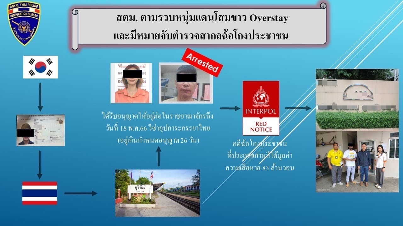 จากการสืบสวนเจ้าหน้าที่ชุดจับกุมทราบว่า นายมุน อยู่ในราชอาณาจักรโดยการอนุญาตสิ้นสุด และเป็นผู้ต้องหาตามหมายแดงที่สาธารณรัฐเกาหลีต้องการตัวในข้อหา ฉ้อโกงประชาชน จึงทำการตรวจสอบในระบบสารสนเทศ ตม. ทราบว่า นายมุน ได้ยื่นขออยู่ต่อในราชอาณาจักร ประเภทภรรยาไทย ที่ ตม.จว.บุรีรัมย์ โดยได้รับอนุญาตให้อยู่ต่อในราชอาณาจักร ถึงวันที่ 18 พ.ค.66 ซึ่งอยู่เกินกำหนดอนุญาตแล้ว