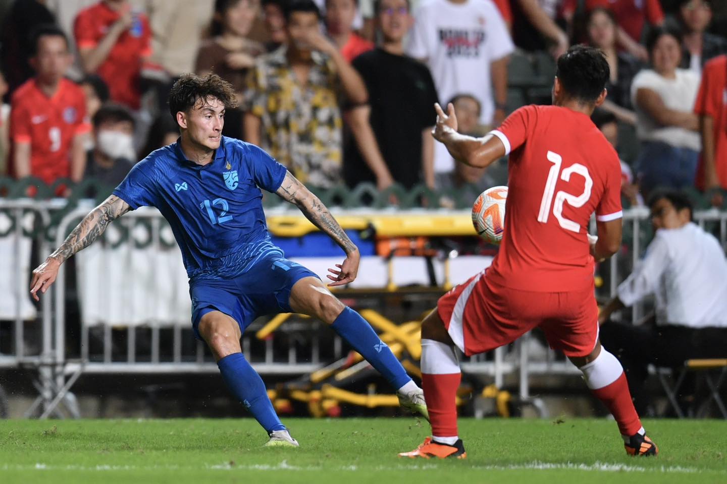 นาทีที่ 35 ไทยมาได้ลุ้นอีกครั้งจากจังหวะเตะมุมสั้น และเป็นสุภโชค สารชาติ ที่กดด้วยขวา ไปติดเซฟ ออกหลังไปอีก และไม่มีจังหวะเพิ่มเติมจบครึ่งแรกยัง 0-0