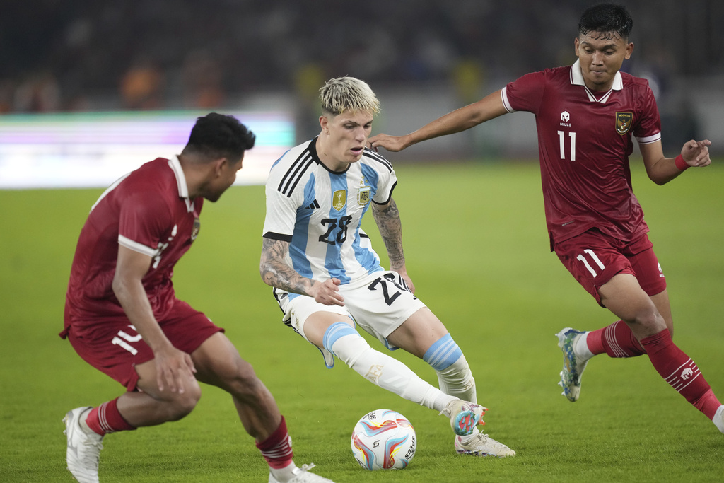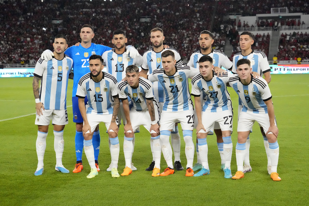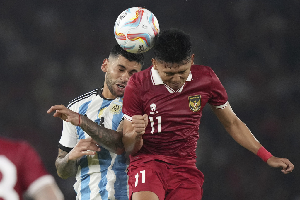 Team Argentina pose for photographers prior to their friendly soccer match against Indonesia at Gelora Bung Karno Main Stadium in Jakarta, Indonesia, Monday, June 19, 2023. (AP Photo/Achmad Ibrahim)Argentina’s Alejandro Garnacho Ferreyra, center, battles for the control of the ball against Indonesia’s Asnawi Mangkualam, left, and Dendy Sulistiawan during their friendly soccer match at Gelora Bung Karno Main Stadium in Jakarta, Indonesia, Monday, June 19, 2023. (AP Photo/Tatan Syuflana)Argentina’s Cristian Romero, left, battles for the ball against Indonesia’s Dendy Sulistiawan during their friendly soccer match at Gelora Bung Karno Main Stadium in Jakarta, Indonesia, Monday, June 19, 2023. (AP Photo/Tatan Syuflana)