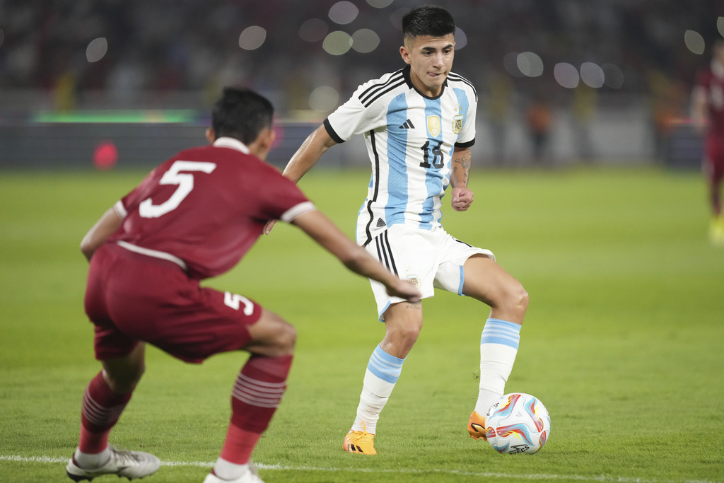 Argentina’s Alejandro Garnacho Ferreyra, right, battles for the ball against Indonesia’s Asnawi Mangkualam during their friendly soccer match at Gelora Bung Karno Main Stadium in Jakarta, Indonesia, Monday, June 19, 2023. (AP Photo/Tatan Syuflana)