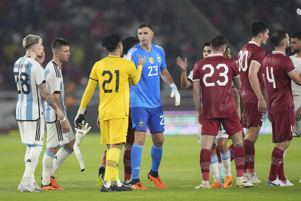 Argentina’s Emiliano Martinez, center, shakes hands with Indonesia’s Ernando Ari Sutaryadi at the end of their friendly soccer match at Gelora Bung Karno Main Stadium in Jakarta, Indonesia, Monday, June 19, 2023. (AP Photo/Tatan Syuflana)
