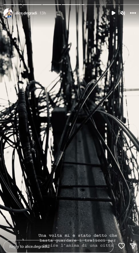 ทั้งนี้ ภายในคลิปภาพบนไอจีสตอรี่ขอ “อลิซ เดกราดี” ดังกล่าวก็ได้โพสต์เป็นรูปสายเคเบิลจากเสาไฟฟ้าอันแสนวุ่นวายแห่งหนึ่งที่คาดว่าจะเป็นกรุงเทพฯ ก็ได้มีข้อความเล็ก ๆ ระบุไว้ด้านท้ายว่า