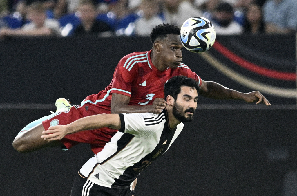 Colombia’s Jhon Lucumi leaps to head the ball over Germany’s Ilkay Gundogan during an international friendly soccer match between Germany and Colombia at Veltins-Arena in Gelsenkirchen, Germany, Tuesday, June 20, 2023. (Bernd Thissen/dpa via AP)