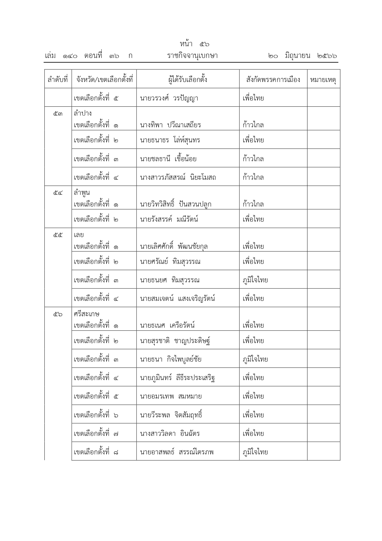 วันที่ 21 มิถุนายน 2566 เว็บไซต์ราชกิจจานุเบกษา เผยแพร่ ประกาศคณะกรรมการการเลือกตั้ง (กกต.) 2 ฉบับ โดยฉบับแรก เรื่อง ผลการเลือกตั้งสมาชิกสภาผู้แทนราษฎรแบบแบ่งเขตเลือกตั้ง ลงนามโดย นายอิทธิพร บุญประคอง ประธานกรรมการการเลือกตั้ง