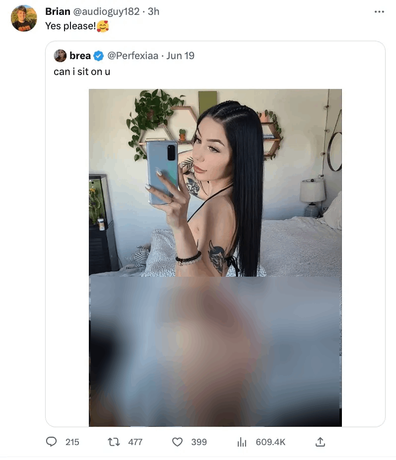 โดยดาว OnlyFans คนดังกล่าว ได้โพสต์รูปหวิวของตนเองพร้อมเขียนแคปชั่นว่า “ขอฉันไปนั่งบนตัวคุณได้ไหม?” ซึ่งทางไบรอันก็รีทวีตภาพดังกล่าวและเขียนข้อความว่า “ด้วยความยินดีครับ!” โดยข้อความนี้ถูกเขียนขึ้นไม่กี่นาทีหลังจากที่เขาเพิ่งเขียนภาวนาให้ครอบครัวเขาปลอดภัย