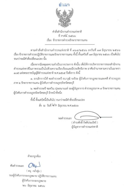 โดยจดหมายมีใจความว่า “ตามคำสั่งสำนักงานตำรวจแห่งชาติ ที่ 368/2566 ลงวันที่ 17 มิ.ย. เรื่อง ข้าราชการตำรวจปฏิบัติราชการและรักษาราชการแทน ทั้งนี้ ตั้งแต่วันที่ 17 มิ.ย.เป็นต้นไป จนกว่าจะมีคำสั่งเปลี่ยนแปลงนั้น เนื่องจากมีเหตุผลความจำเป็นบางประการ ดังนั้น เพื่อให้การบริหารราชการของสำนักงานตำรวจแห่งชาติ ในภาพรวมเป็นไปด้วยความเรียบร้อยและมีประสิทธิภาพ อาศัยอำนาจตามความในมาตรา 105 แห่งพระราชบัญญัติตำรวจแห่งชาติ พ.ศ.2565 จึงสั่งการ ดังนี้