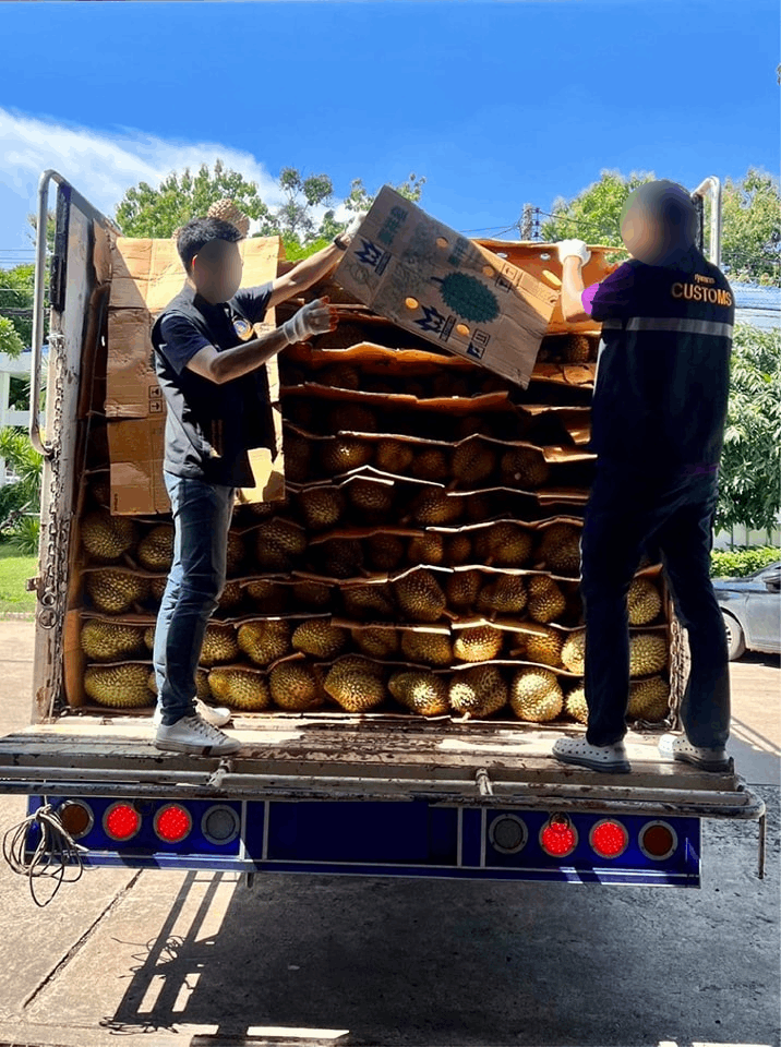 ล่าสุด นายพชร อนันตศิลป์ อธิบดีกรมศุลกากร เปิดเผยว่า เมื่อวันที่ 23 มิ.ย.66 เวลา 06.00 น. เจ้าหน้าที่ได้รับแจ้งจากสายลับว่าจะมีการนำทุเรียนลักลอบนำเข้าจากแนวชายแดนไทย-กัมพูชา บริเวณ ต.คลองน้ำใส อ.อรัญประเทศ จ.สระแก้ว จึงขอให้เจ้าหน้าที่ไปตรวจค้นจับกุม โดยสายลับจะเป็นผู้นำชี้ให้ตรวจค้นด้วยตนเอง กระทั่งเวลา 08.00 น. เจ้าหน้าที่ได้รับแจ้งจากสายลับว่ารถบรรทุกที่ขนทุเรียนลักลอบได้ออกจากพื้นที่แนวชายแดนแล้ว มุ่งหน้าไปทางถนนหมายเลข 317 เจ้าหน้าที่จึงลงพื้นที่บริเวณที่สายลับแจ้ง จนกระทั่งเวลาประมาณ 09.45 น. ได้พบรถบรรทุก 6 ล้อ หมายเลขทะเบียน 68-2537 กทม. มีผ้าใบคลุมทับ ตามที่ได้รับแจ้งที่บริเวณหน้า รพ.วังสมบูรณ์ ต.วังสมบูรณ์ อ.วังสมบูรณ์ จ.สระแก้ว เจ้าหน้าที่จึงให้สัญญาณหยุดรถเพื่อขอตรวจค้น