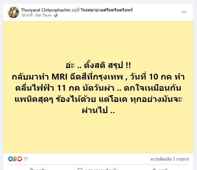 “ตั้งสติ สรุป! กลับมาทำ MRI ฉีดสีที่กรุงเทพ, วันที่ 10 กรกฎาคม ทำคลื่นไฟฟ้า 11 กรกฎาคม นัดวันผ่า ตกใจเหมือนกัน แพนิคสุด ๆ ร้องไห้ด้วย แต่โอเค ทุกอย่างมันจะผ่านไป”.