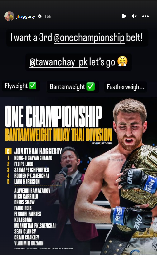 ถือว่าเป็นการลั่นกลองรบกลายๆ เมื่อทาง โจนาธาน แฮ็กเกอร์ตี นักชกสัญชาติอังกฤษ เจ้าของเข็มขัดแชมป์โลก ONE มวยไทย รุ่นแบนตัมเวต และเป็นอดีตแชมป์โลก ONE มวยไทย รุ่นฟลายเวต ได้โพสต์สตอรี่ผ่านอินสตาแกรมส่วนตัว @jhaggerty_ พร้อมแท็กหา ตะวันฉาย พี.เค.แสนชัยมวยไทยยิม แชมป์โลก ONE เฟเธอร์เวต มวยไทย พร้อมข้อความว่า “ผมต้องการเข็มขัดเส้นที่ 3 ของศึก ONE Championship”