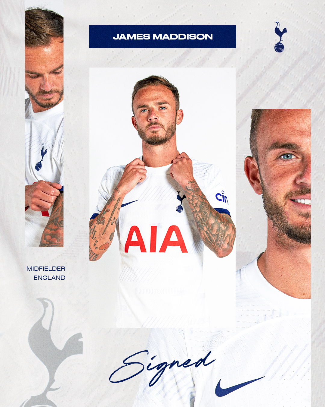 เมื่อวันที่พุธที่ 28 มิถุนายน ที่ผ่านมา เว็บไซต์และสื่อโซเชี่ยลของ สเปอร์ส ทีมดังพรีเมียร์ลีก แถลงประกาศคว้า เจมส์ แมดดิสัน มาจาก เลสเตอร์ ซิตี้ อดีตทีมร่วมพรีเมียร์ลีกที่ร่วงตกชั้นไป โดยมีรายงานว่าทัพไก้เดือยทองจ่ายค่าตัวในดีลนี้เป็นมูลค่า 40 ล้านปอนด์ (ประมาณ 1,760 ล้านบาท)