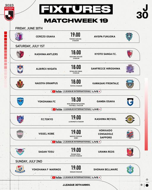 ตารางแข่งขัน เจลีก ญี่ปุ่น 2023 สัปดาห์ที่ 19 แข่งวันที่ 30 มิถุนายน – 2 กรกฎาคม นี้ เช็กโปรแกรมแข่ง ตารางการแข่งขัน ฟุตบอลรายการอันดับหนึ่งของลีกญี่ปุ่น เช็กช่องถ่ายทอดสดทาง Youtube Siamsport ช่องทางดูบอลออนไลน์ได้ ที่นี่