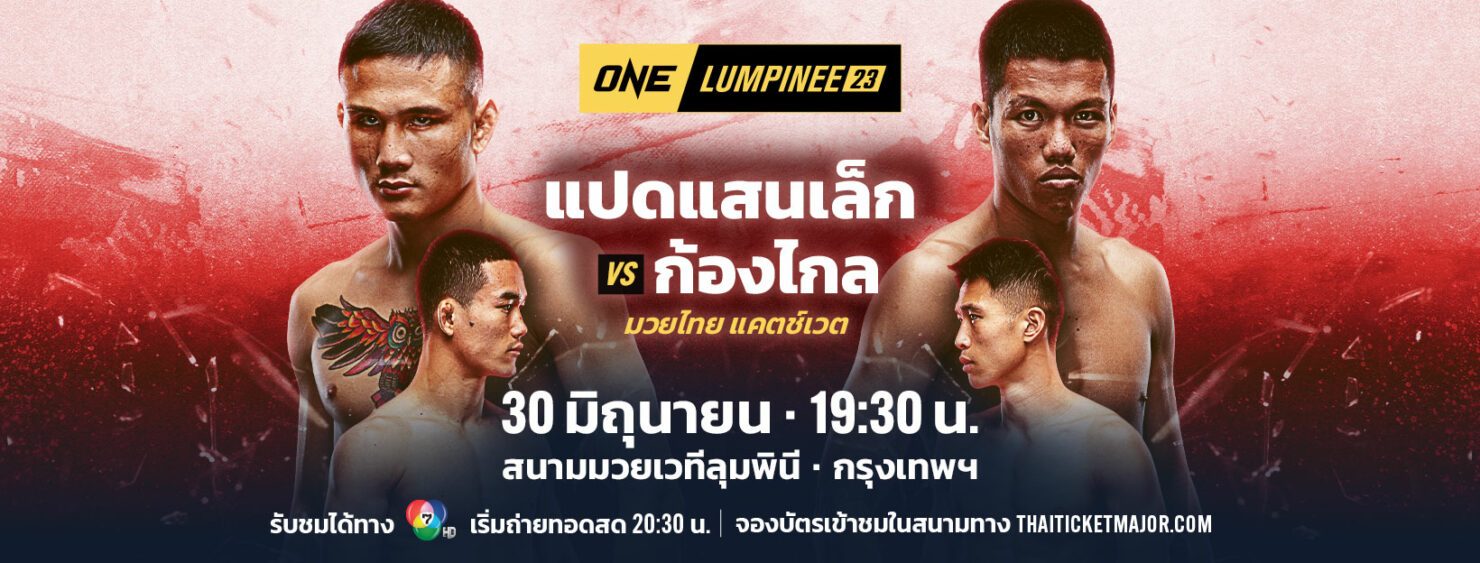 โปรแกรมมวย ONE ลุมพินี 23 สัปดาห์นี้ คู่เอกของรายการ “แปดแสนเล็ก พีเค.แสนชัยมวยไทยยิม” มวยหมัดหนัก วัย 28 ปี จากอุบลราชธานี เปิดหน้าแลกสุดตัวกับ “ก้องไกล เอ็นนี่มวยไทย” มวยซ้ายสู้ไม่ถอย วัย 24 ปี จากพิษณุโลก หลังผ่านไปสองไฟต์ยังชนะใครไม่เป็นทั้งคู่ โดยจะดวลฝีมือกันในกติกามวยไทย พิกัดแคตช์เวต 140 ป.