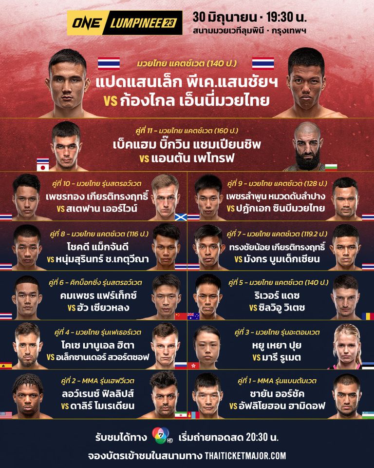 โปรแกรมมวย รายการ ONE Lumpinee 23 ประจำวันศุกร์ที่ 30 มิถุนายน 2566 เริ่มรายการเวลา 19.30 น. และเริ่มถ่ายทอดสดทางช่อง 7HD เวลา 20.30