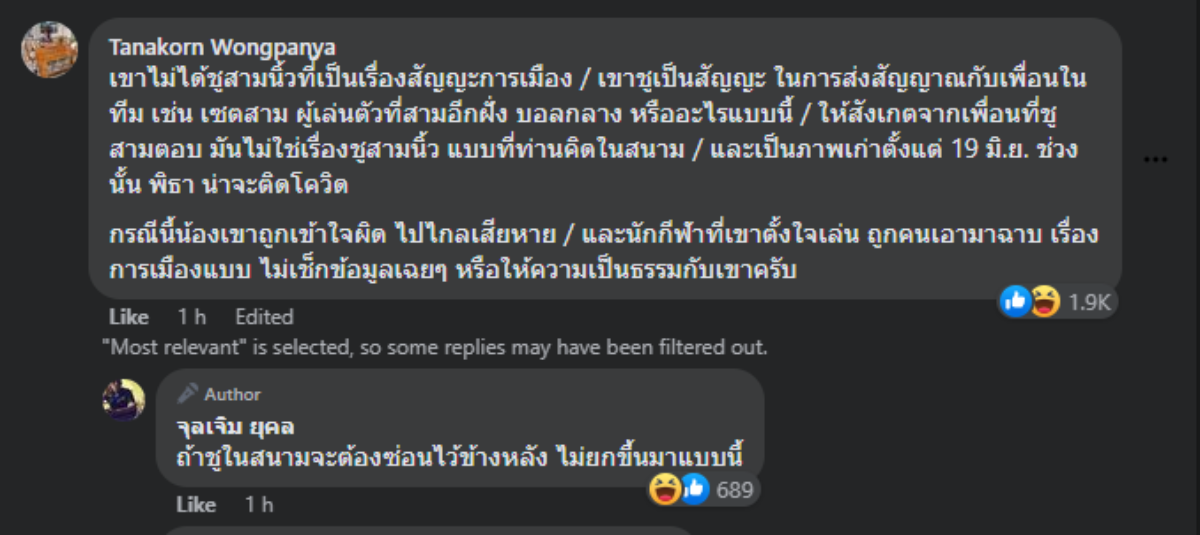 “เขาไม่ได้ชูสามนิ้วที่้เป็นเรื่องสัญญะการเมือง / เขาชูเป็นสัญญะ ในการส่งสัญญาณกับเพื่อนในทีม เช่น เซตสาม ผู้เล่นตัวที่สามอีกฝั่ง บอลกลาง หรืออะไรแบบนี้ / ให้สังเกตจากเพื่อนที่ชูสามตอบ มันไม่ใช่เรื่องชูสามนิ้ว แบบที่ท่านคิดในสนาม / และเป็นภาพเก่าตั้งแต่ 19 มิ.ย. ช่วงนั้น พิธา น่าจะติดโควิด