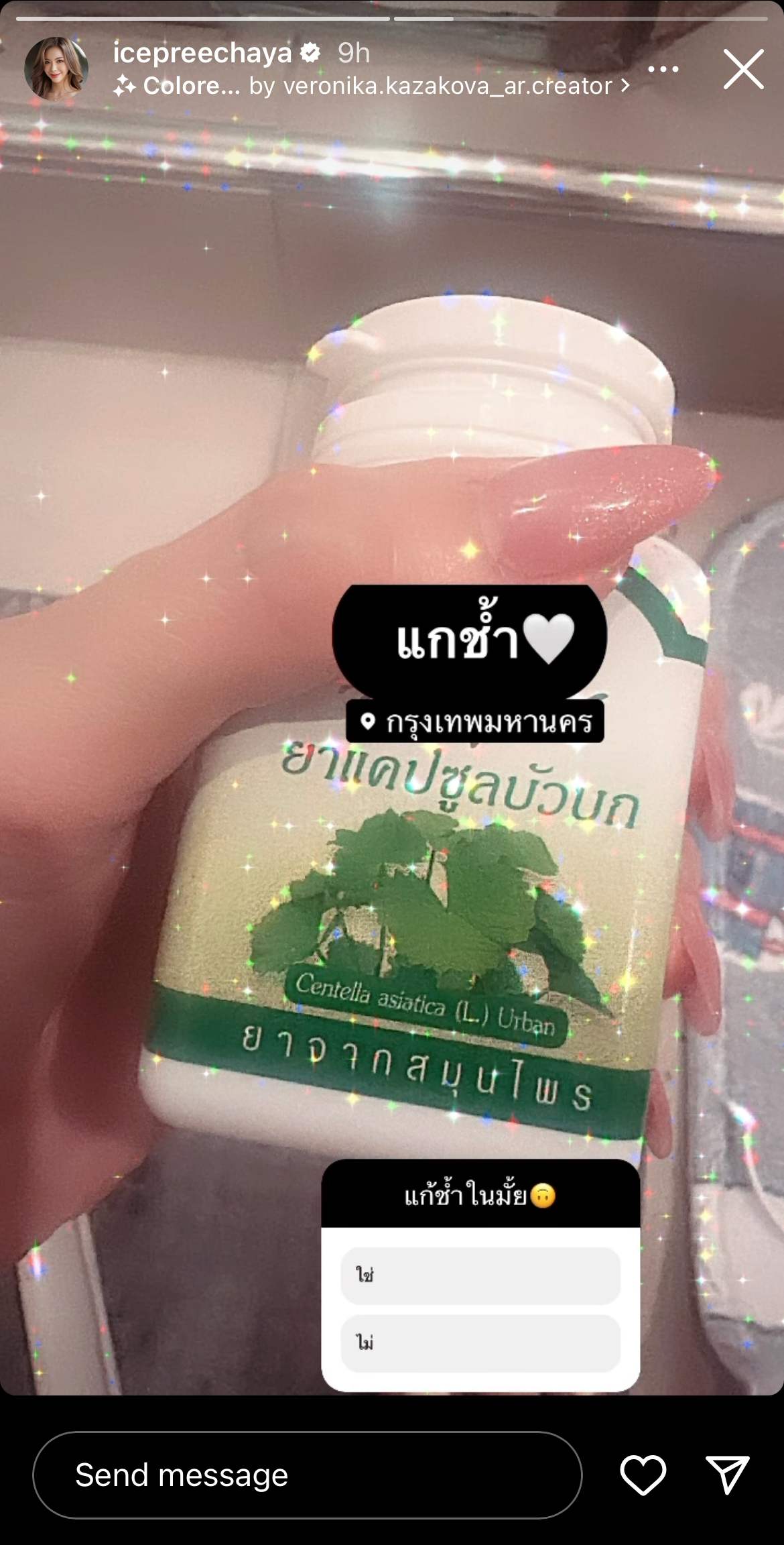 ล่าสุด ไอซ์ ปรีชญา ได้โพสต์สตอรี่อินสตาแกรม IG @icepreechaya เป็นภาพจอดำ ตามด้วยภาพมือที่ถือขวดแคปซูลบัวบก พร้อมแคปชั่น “แก้ช้ำ” แถมยังโพสต์ถามอีกว่า “แก้ช้ำในมั้ย” โดยใส่เพลงประกอบเนื้อหาเกี่ยวกับความรักที่ไม่สมหวัง เสียใจเพราะคนรักที่ไม่จริงใจ