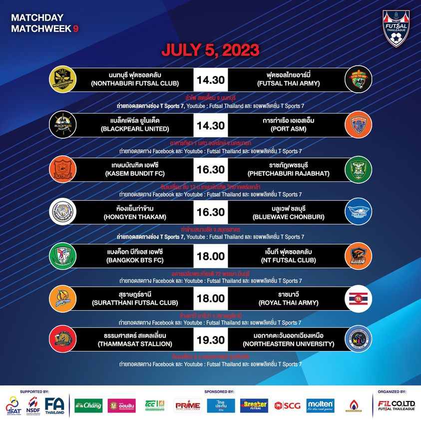 โปรแกรมฟุตซอลไทยลีก 2023 นัดที่ 9 ในวันพุธที่ 5 ก.ค.66 มีการแข่งขันทั้งหมด 7 คู่