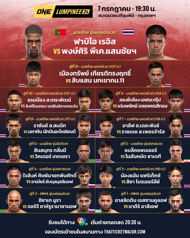 โปรแกรมมวย ONE ลุมพินี 24 สัปดาห์นี้ “ฟาบิโอ เรอิส” มวยแกร่งหมัดดุ วัย 26 ปี จากโปรตุเกส ที่กำลังถูกยกให้เป็น “มือปราบนักมวยไทย” หวังเดินลุยแหลกล้างตา “แฝดอโยธยา” พงษ์ศิริ พีเค.แสนชัยฯ มวยใจใหญ่ไม่กลัวใคร วัย 32 ปี โดยต่างฝ่ายเก็บชัยชนะรวดมาได้สองไฟต์ติดต่อกัน เตรียมวัดฝีมือกันในกติกามวยไทย รุ่นแบนตัมเวต (135 – 145 ป.)