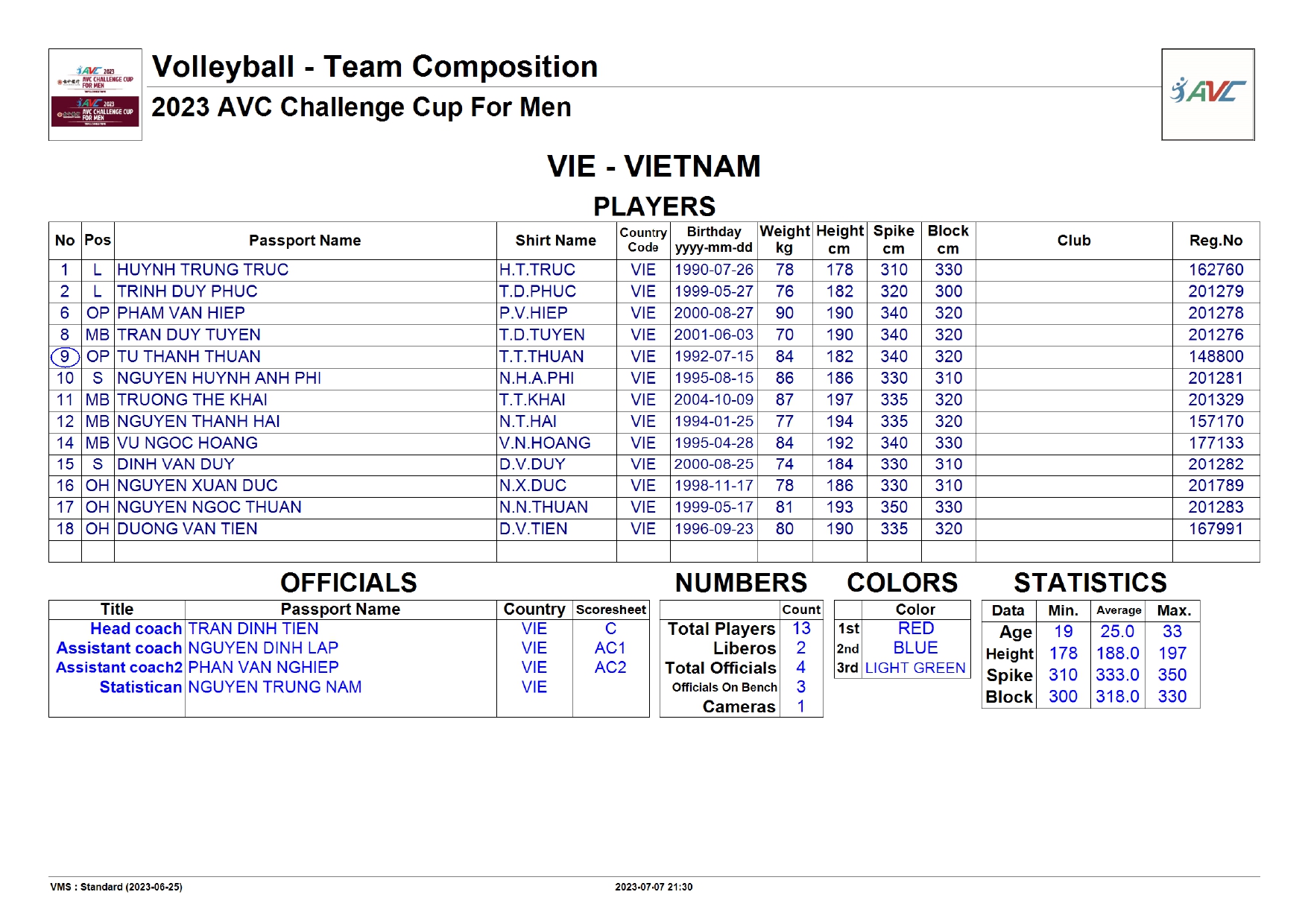 วันนี้ 10 กรกฎาคม 2566 สำนักข่าวเวียดนามรายงานข่าวสุดซวยของทีมนักตบลูกยางชายทีมชาติเวียดนาม ที่ตอนนี้เดินทางไปแข่งวอลเลย์บอลชายชาเลนจ์คัพ 2023 ณ ไต้หวัน เพื่อลุ้นตั๋วไปคัด VNL 2024 โดยกติการการแข่งขัน AVC กำหนดให้ส่งชื่อผู้เล่นได้ 14 คน แต่ปรากฎว่าเวียดนามมีรายชื่อยืนยันอย่างเป็นทางการเพียง 13 คนเท่านั้น
