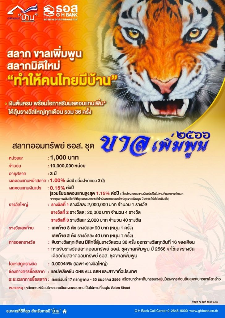 ธอส. จึงได้จัดทำ “สลากออมทรัพย์ ชุด “ขาลเพิ่มพูน ปี 2566” กรอบวงเงินรวม 10,000 ล้านบาท ออมเงินแถมลุ้นรับโชคได้ง่ายๆ เพียงหน่วยละ 1,000 บาท อายุสลาก 3 ปี ให้ผลตอบแทนหน้าสลาก 1.00% ต่อปี และรับผลตอบแทนผันแปร 0.15% ต่อปี รวมรับผลตอบแทนสูงสุด 1.15% ต่อปี
