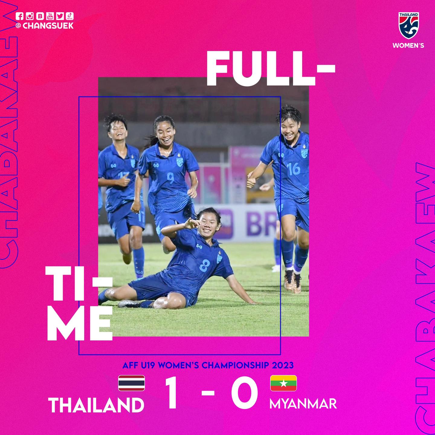 เกมทำท่าว่าจะจบลงด้วยการเสมอ 0-0 อยู่แล้ว แต่ทดเจ็บ พิชญธิดา มะโนวัง ลองลักไก่ยิง แล้วประตูเมียนมา รับกระฉอกเข้าประตูไป ทำให้ ชบาแก้ว U19 นำก่อน 1-0