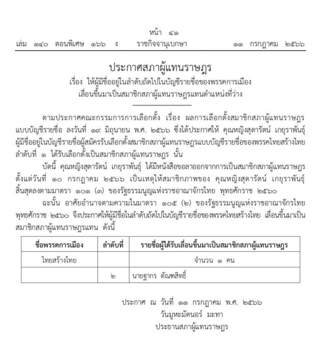 ฉะนั้น อาศัยอำนาจตามความในมาตรา 105(2) ของรัฐธรรมนูญ จึงประกาศให้ นายฐากร ตัณฑสิทธิ์ ผู้มีชื่อในลำดับถัดไปในบัญญีรายชื่อของพรรคไทยสร้างไทย เลื่อขึ้นมาเป็น ส.ส. ตั้งแต่วันที่ 11 ก.ค.นี้