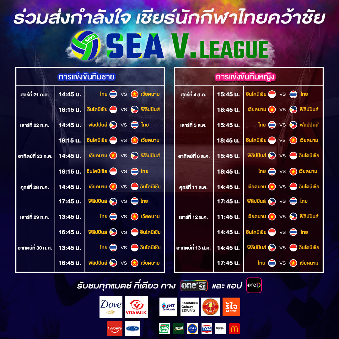 สมาคมกีฬาวอลเลย์บอลแห่งประเทศไทย ร่วมกับ สหพันธ์วอลเลย์บอลแห่งเอเชีย (AVC) แถลงข่าวจัดการแข่งขันวอลเลย์บอลรายการ SEA V League (ซี วี.ลีก) ครั้งที่3 ปี 2023 หรือรายการวอลเลย์บอลอาเซียน กรังด์ปรีซ์ ในชื่อเดิม การชิงชัยของทีมวอลเลย์บอลคู่ปรับตลอดกาลจาก 4 ประเทศ ได้แก่ ไทย, เวียดนาม, อินโดนีเซีย และ ฟิลิปปินส์ ทั้งประเภททีมชายและทีมหญิง ซึ่งจะเริ่มระเบิดความมันส์กันตั้งแต่วันที่ 21 ก.ค. – 13 ส.ค.นี้ โดยสถานโทรทัศน์ช่อง one31 รับหน้าที่ถ่ายทอดสดแบบจัดเต็ม ครบทุก 24 แมตซ์ ทุกสนาม ทั้งทีมชายและทีมหญิง ที่เดียว!! หน้าจอช่องone31 พร้อมดูออนไลน์และดูย้อนหลังได้ทางแอป oneD