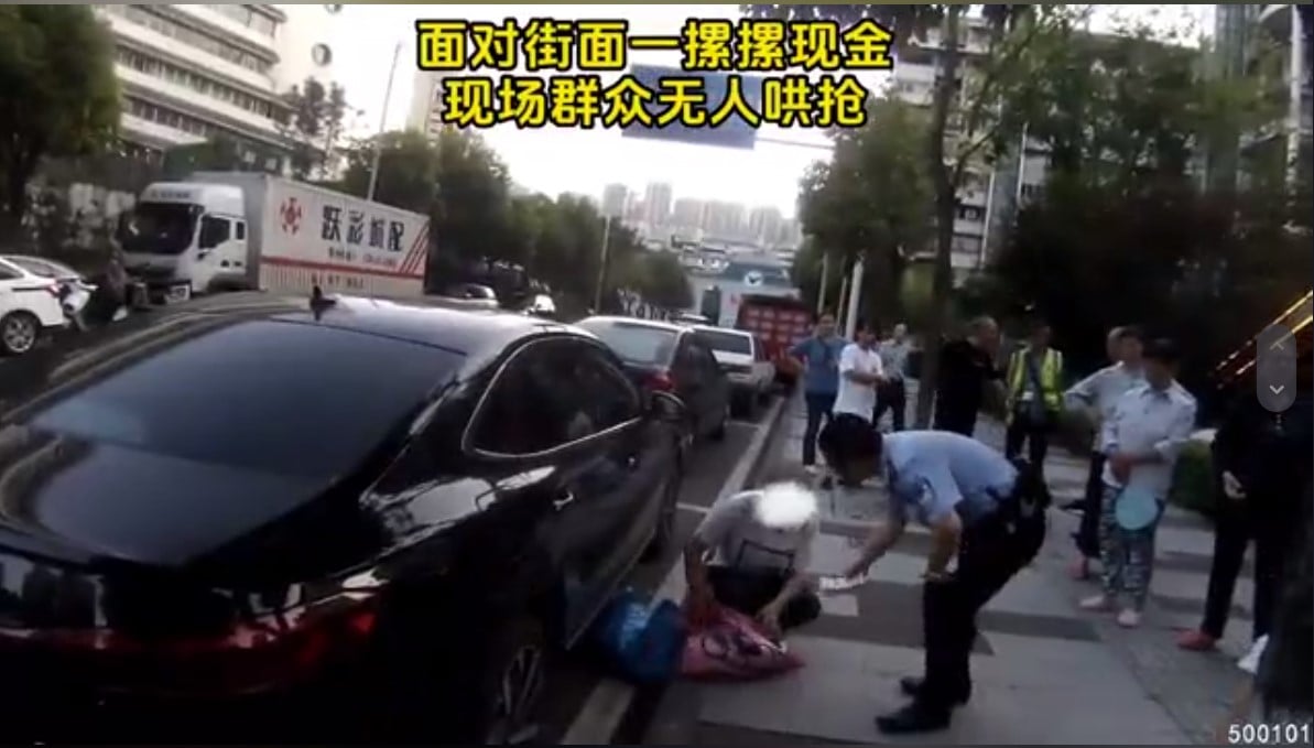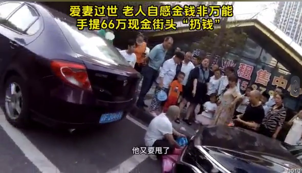 คลิปดังกล่าวแสดงให้เห็นชายวัย 67 ปี หยิบธนบัตรใบละ 100 หยวนออกมาจากถุงพลาสติก 2 ใบบนถนนในเขตเทศบาลนครฉงชิ่ง ทางตะวันตกเฉียงใต้ของจีน และขว้างใส่ผู้คนที่เดินผ่านไปมา พร้อมกับพูดพึมพำ ๆ ไปด้วยว่า “พวกมันไร้ประโยชน์ เอามันไป”