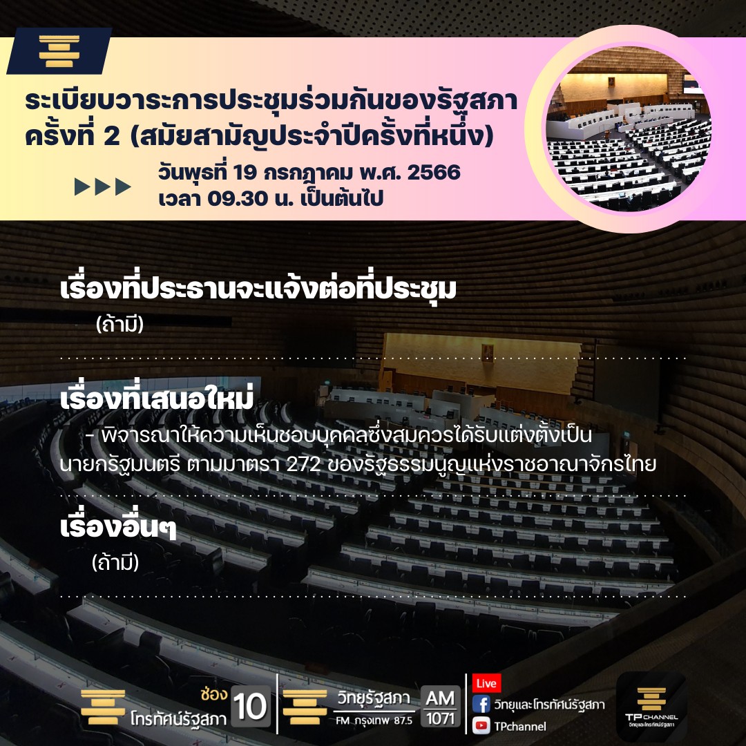 กำหนดการประชุมรัฐสภา เพื่อโหวตนายกฯ รอบ 2 19 กรกฎาคม 2566