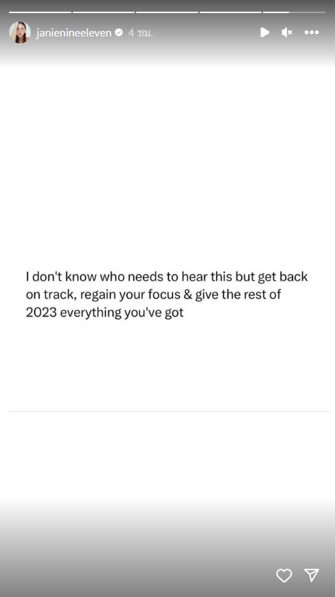 “I don’t know who needs to hear this but get back on track regain your focus & give the rest of 2023 everything you’ve got” แปลแคปชั่นเป็นภาษาไทยว่า “ฉันไม่รู้ว่าใครต้องฟังเรื่องนี้บ้าง แต่กลับมาสู่เส้นทางอีกครั้ง ตั้งสมาธิใหม่และมอบทุกสิ่งที่คุณมีในปี 2023 ที่เหลือนับจากนี้”