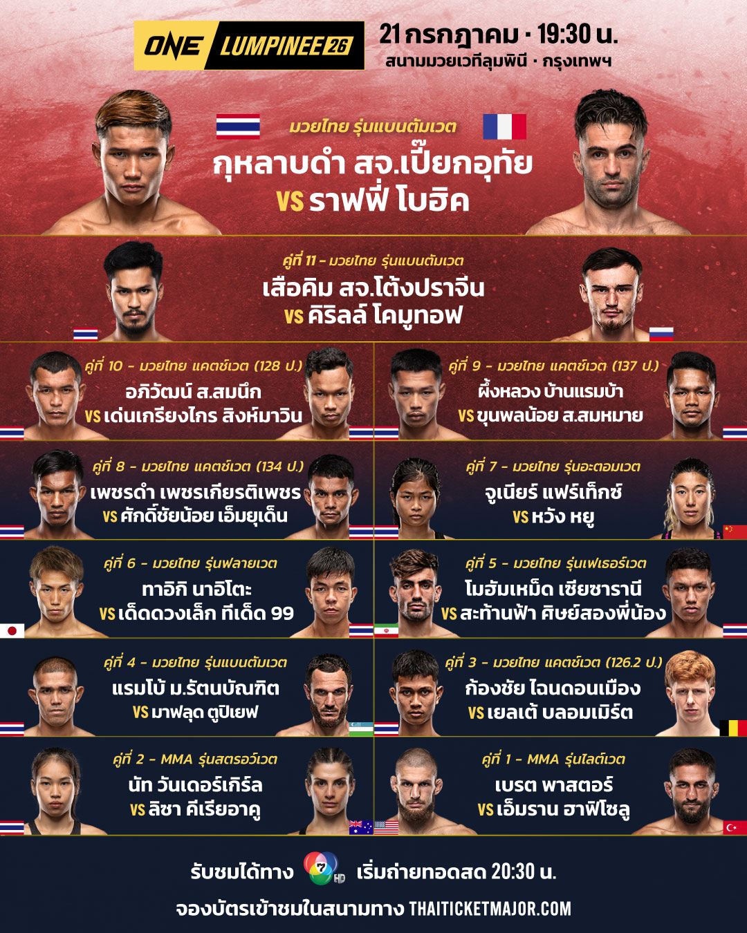 โปรแกรมมวย รายการ ONE Lumpinee 26 ประจำวันศุกร์ที่ 21 กรกฎาคม 2566 เริ่มรายการเวลา 19.30 น. และเริ่มถ่ายทอดสดทางช่อง 7HD เวลา 20.30
