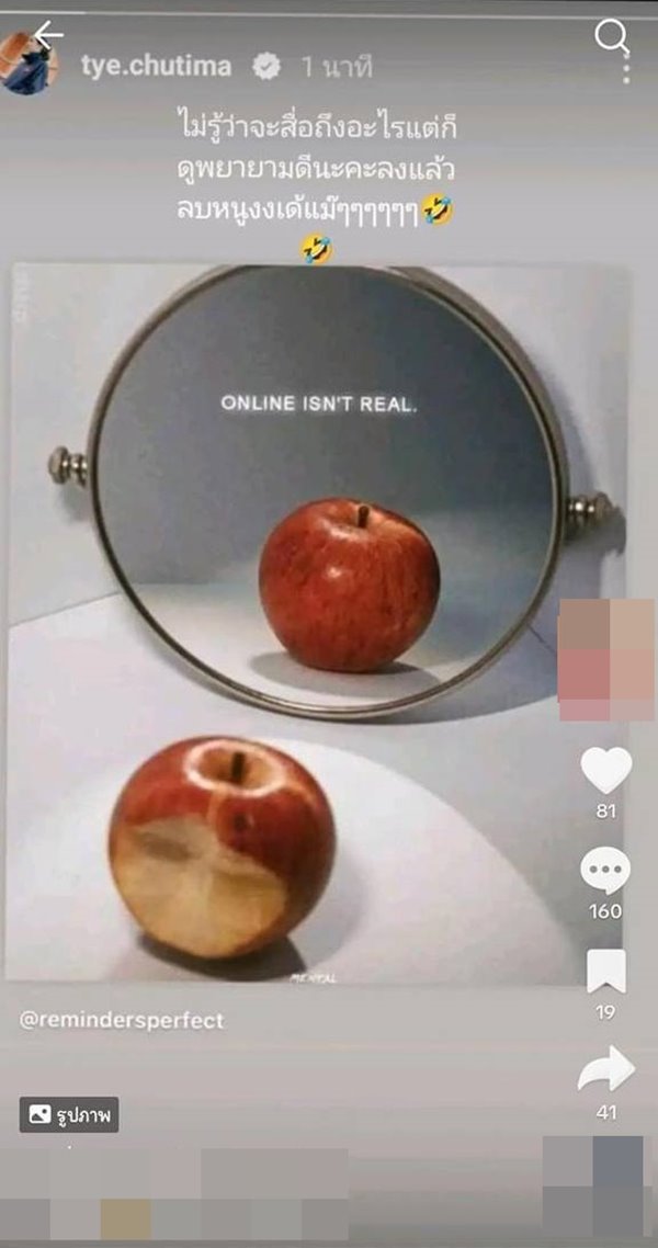 โดยโพสต์ดังกล่าวนั้น แม่ต่าย ชุติมา โพสต์ได้ไม่นานก็ถูกลบออกไป แต่ชาวเน็ตแคปทันและนำออกมาแชร์ต่อ ซึ่งในโพสต์เป็นภาพลูกแอปเปิลที่ด้านหนึ่งถูกกัดไปแล้ว แต่เงาสะท้อนในกระจกกลับเป็นผลแอปเปิลอีกด้านที่ไม่มีรอยกัด และมีแคปชั่นว่า “ONLINE ISN’T REAL.” พร้อมกับแคปชั่นของต่ายว่า