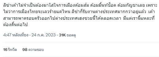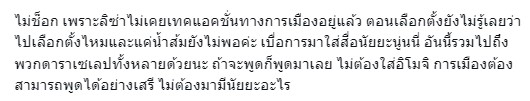 “ไม่ช็อก เพราะลิซ่าไม่เคยเทคแอคชั่นทางการเมืองอยู่แล้ว ตอนเลือกตั้งยังไม่รู้เลยว่าไปเลือกตั้งไหมและแค่น้ำส้มยังไม่พอค่ะ เบื่อการมาใส่สื่อนัยยะนู่นนี่ อันนี้รวมไปถึงพวกดาราเซเลปทั้งหลายด้วยนะ ถ้าจะพูดก็พูดมาเลย ไม่ต้องใส่อิโมจิ การเมืองต้องสามารถพูดได้อย่างเสรี ไม่ต้องมามีนัยยะอะไร”